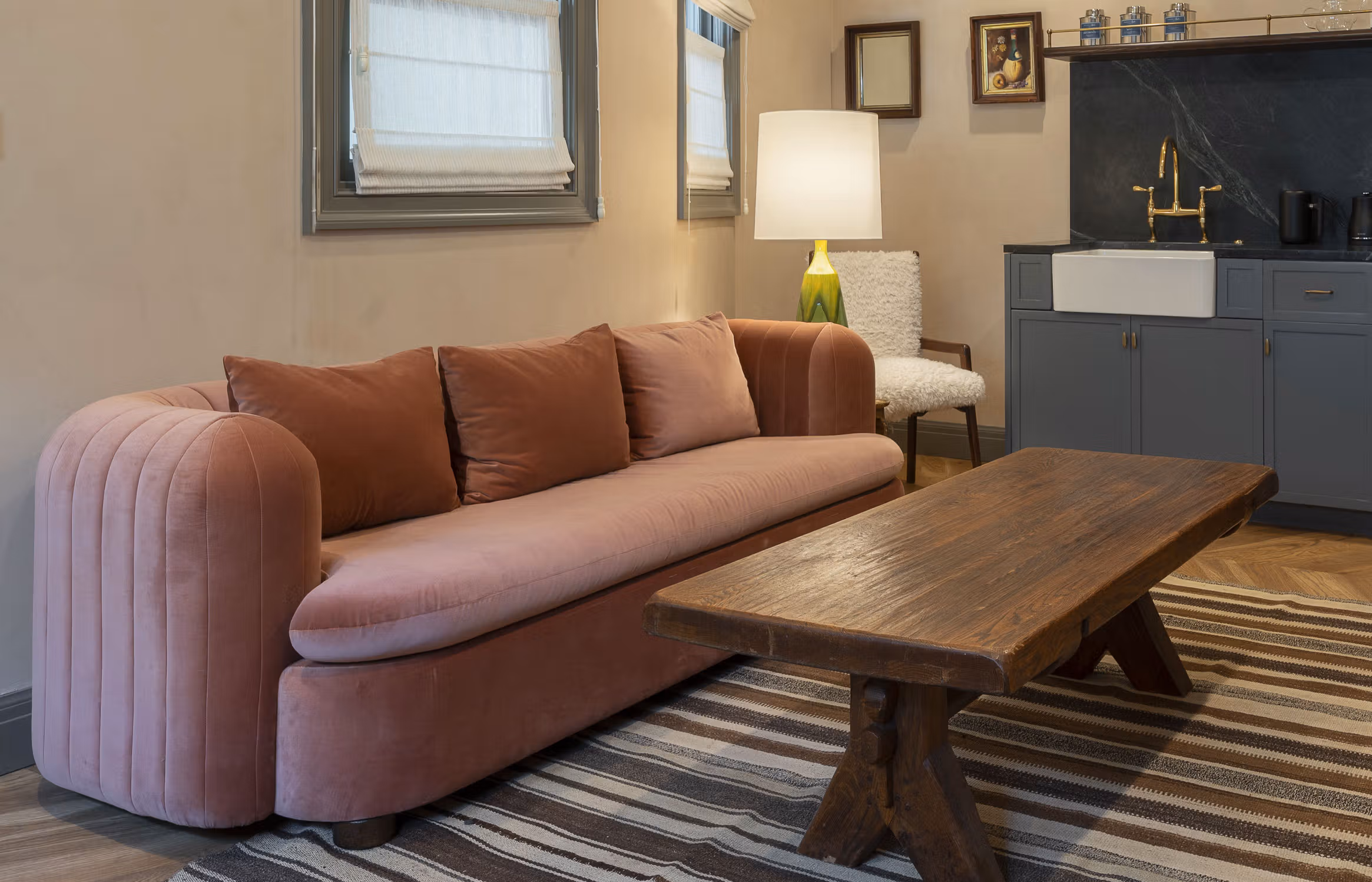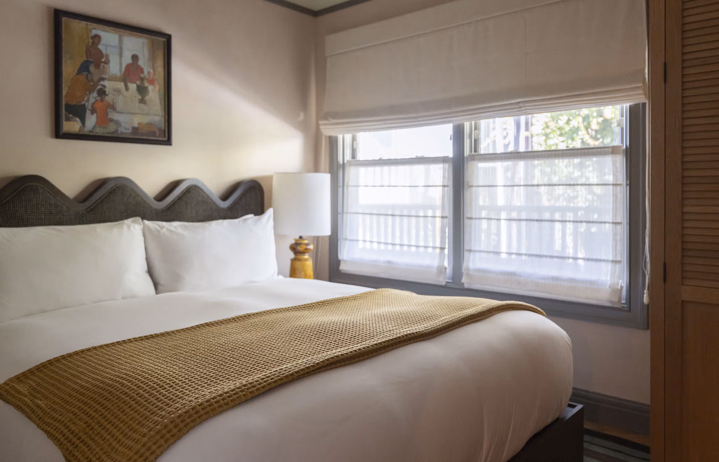 The Courtyard Junior Suite is appointed with a mix of bespoke furnishings, custom artwork, and vintage finds — featuring a private bedroom with king-sized bed; dedicated space for dining, relaxing, or working; and fully-equipped kitchenette that include Smeg refrigerators, cooking tools, and locally handmade ceramics. Each downstairs suite is also accessible from our interior courtyard, offering ease of access to our intimate outdoor space.