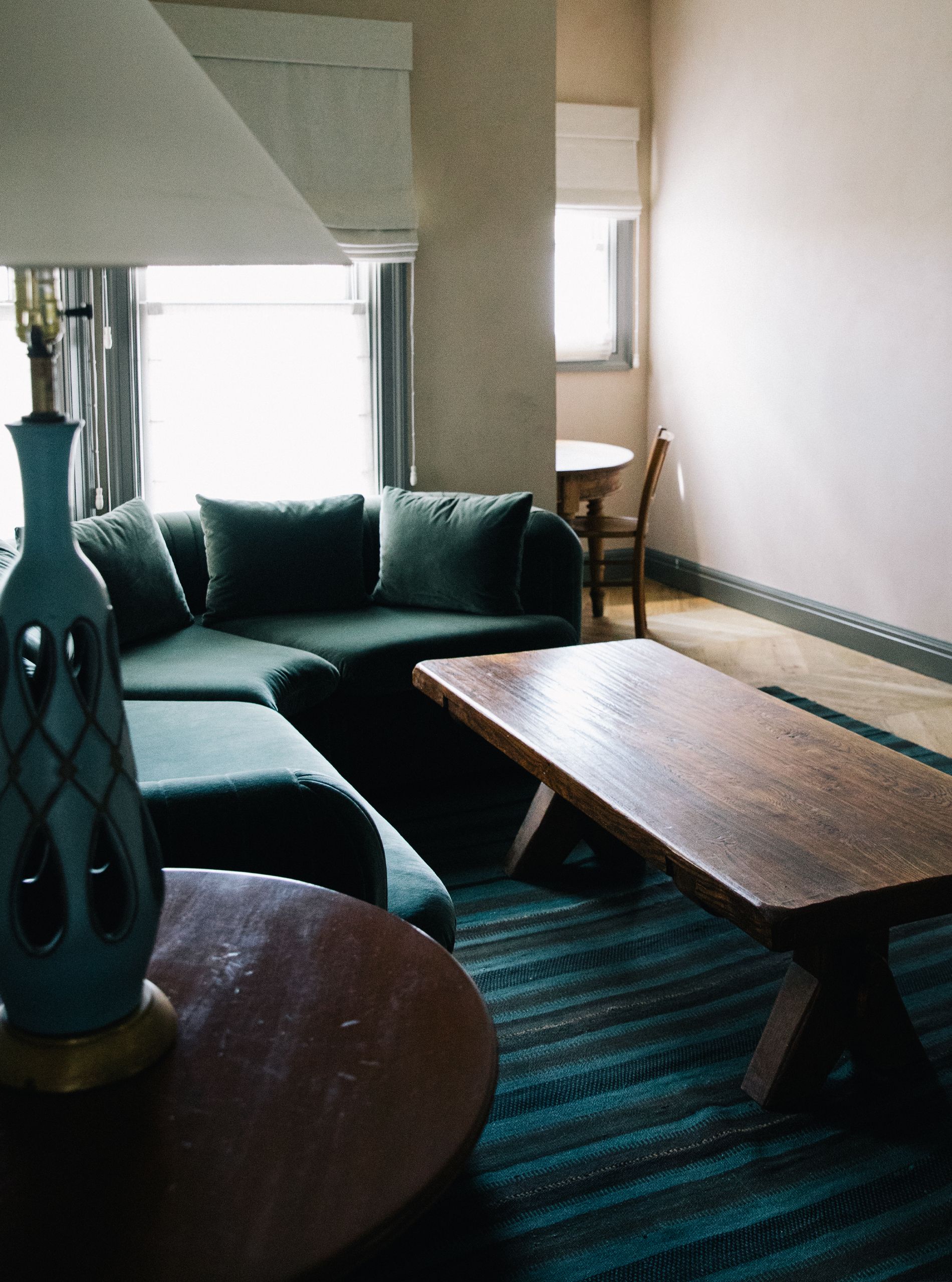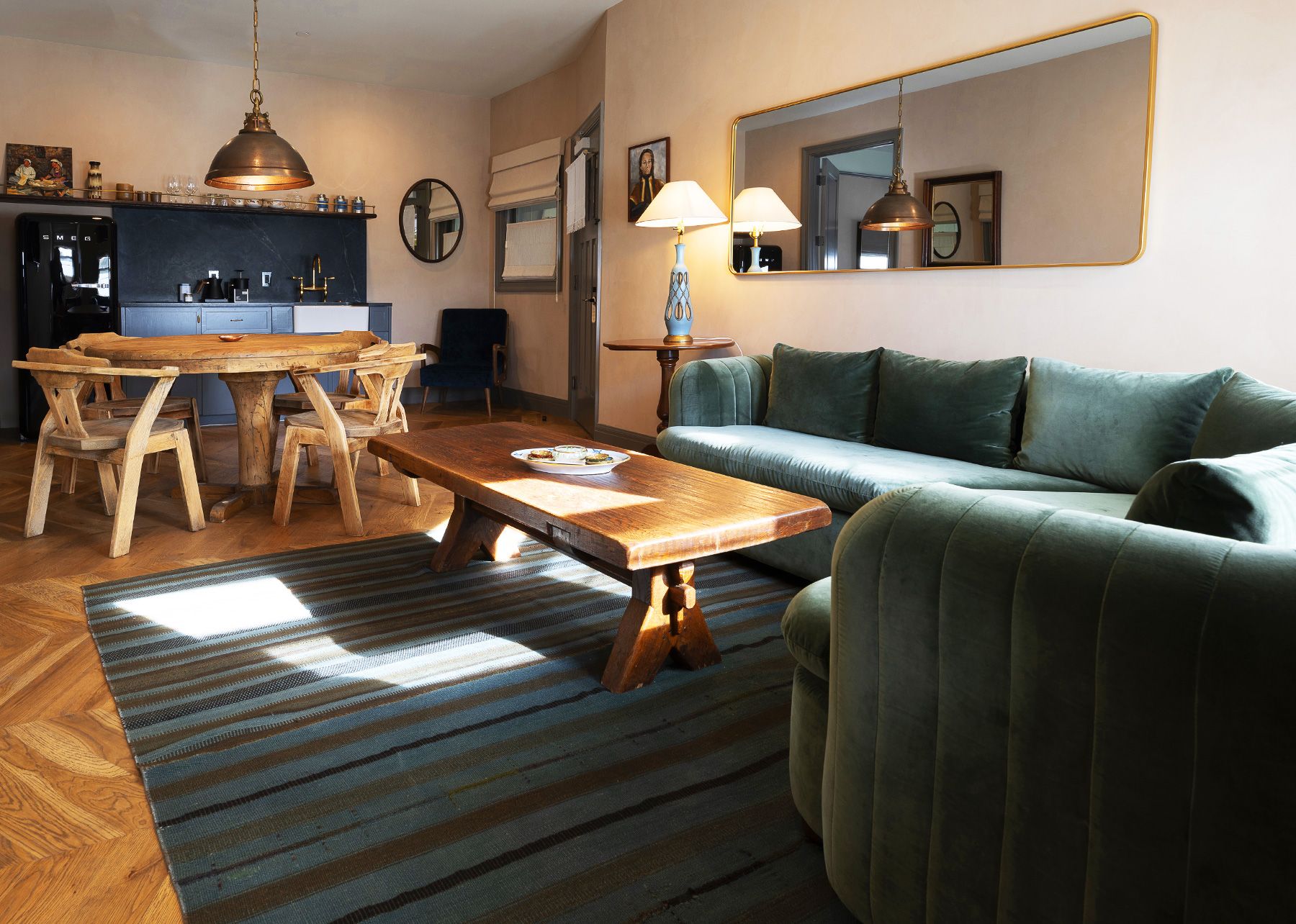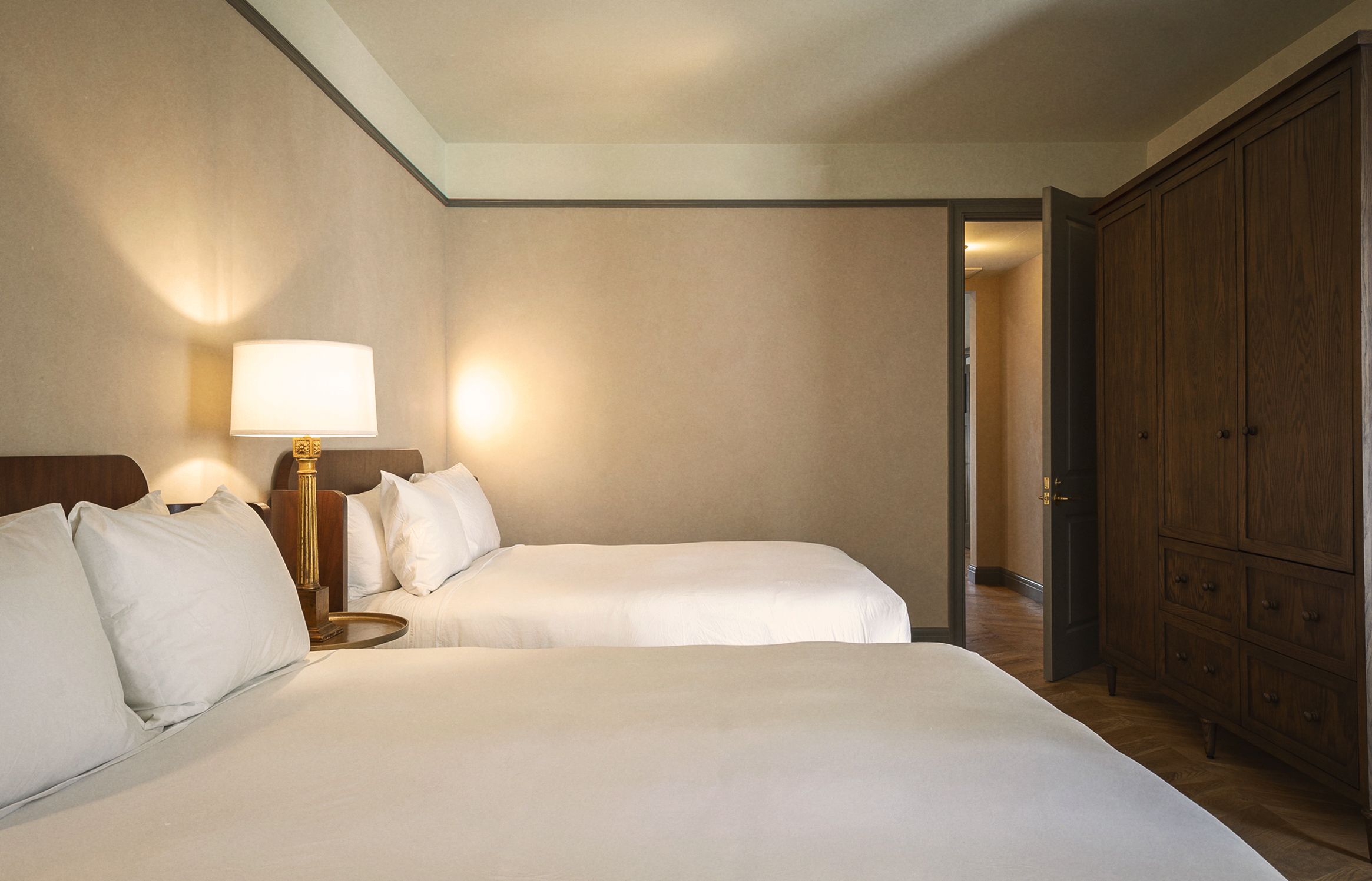 A spacious option for families or traveling friends, our Double Queen Suites are located on the first floor and include a private bedroom with two queen-sized beds; space for relaxing or working; a kitchenette with a Smeg refrigerator; and custom upholstered furniture and specially sourced vintage pieces throughout.