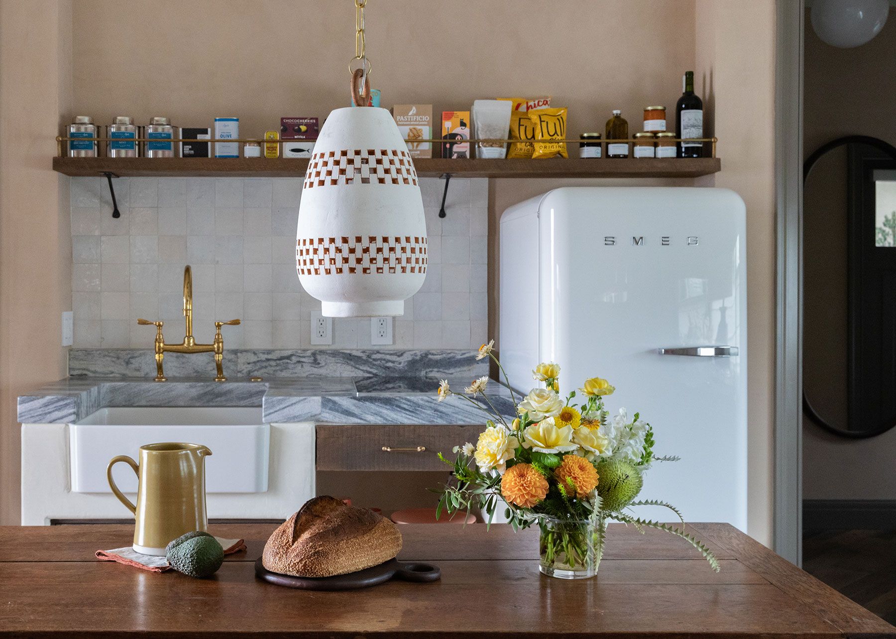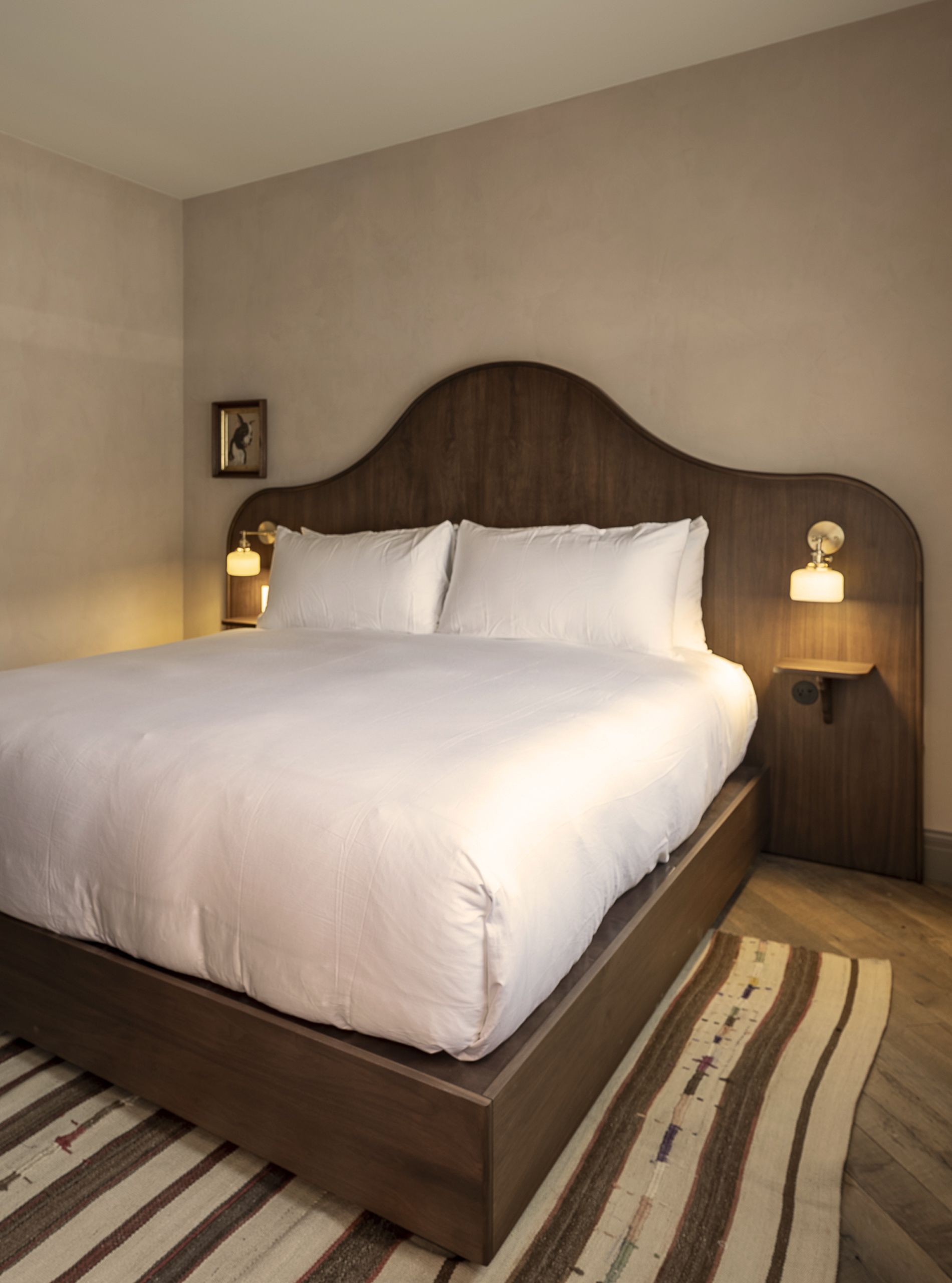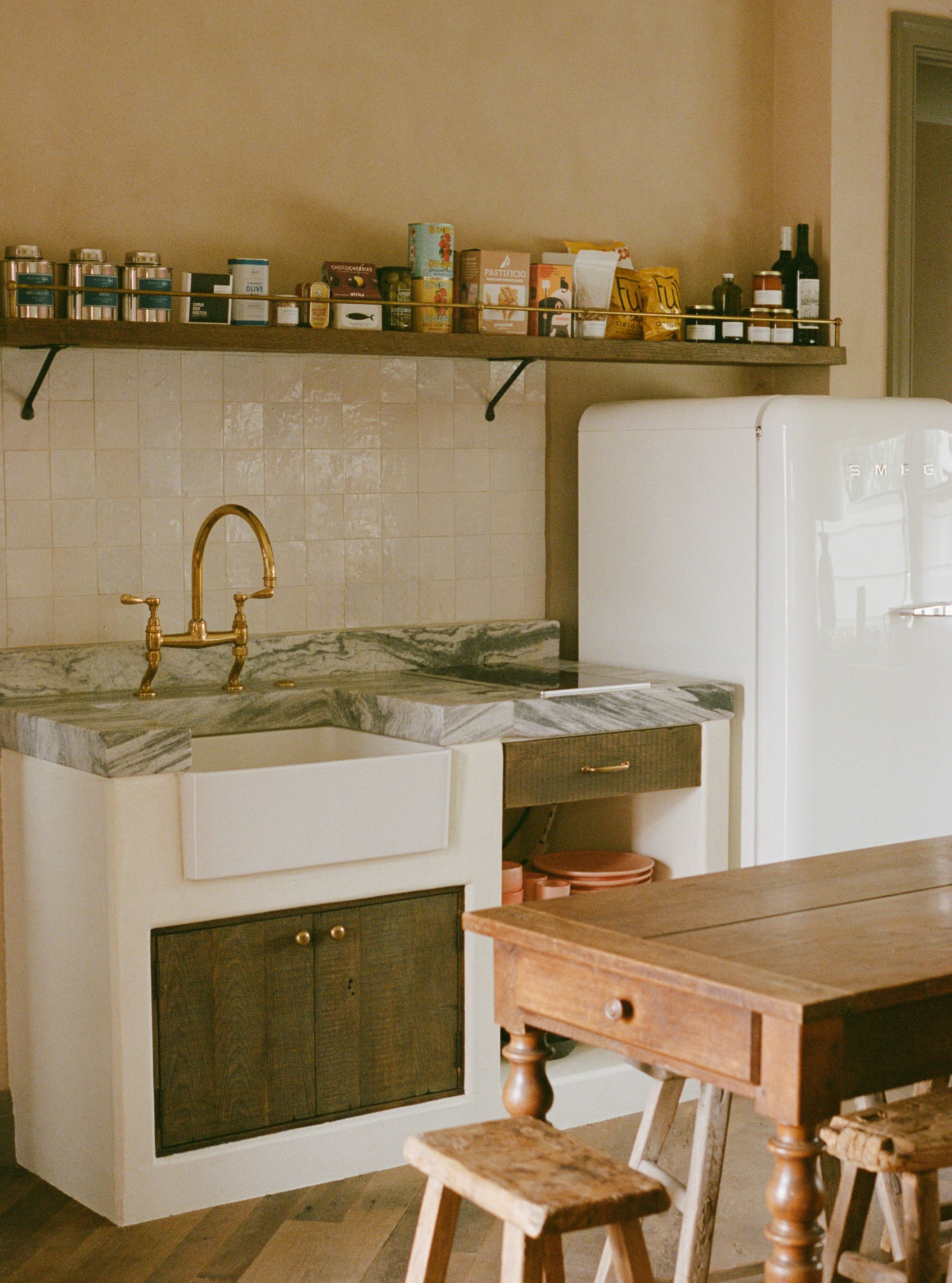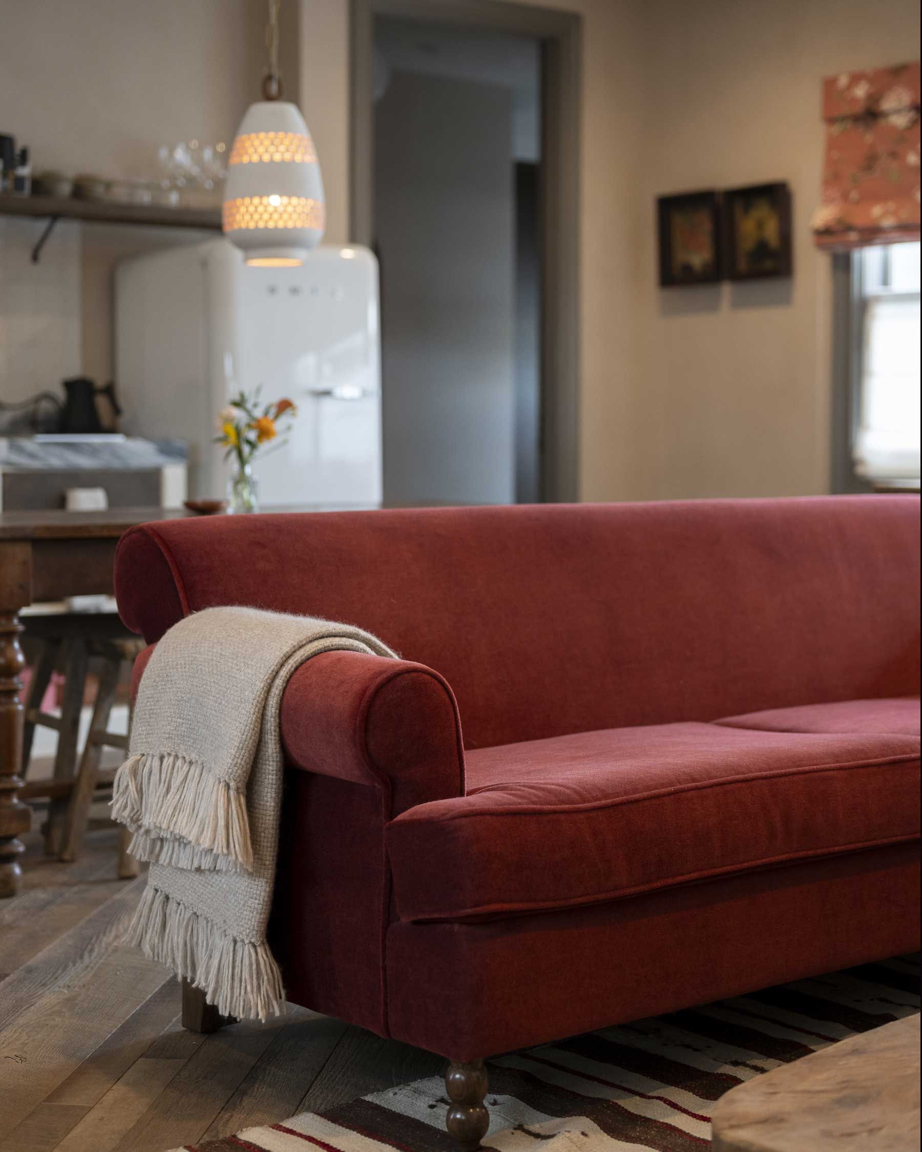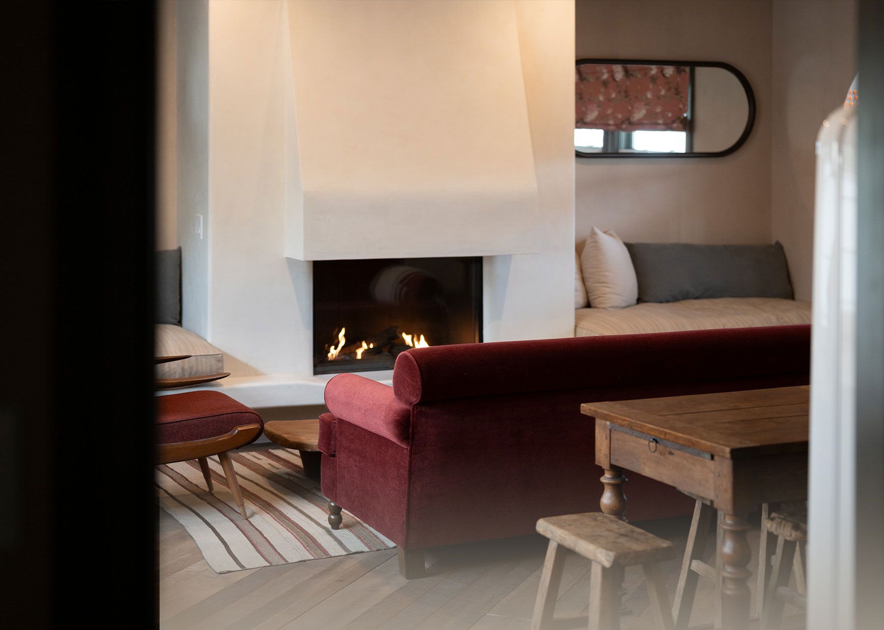 A large suite that feels apartment-like in spaciousness and comfort, with a working fireplace for chilly Venice mornings or evenings. The suite also includes a separate bedroom with a king-sized bed; a fully-equipped kitchenette and full-sized Smeg refrigerator; and dedicated space for dining & living, all detailed with custom furnishings, vintage finds, and handmade details.