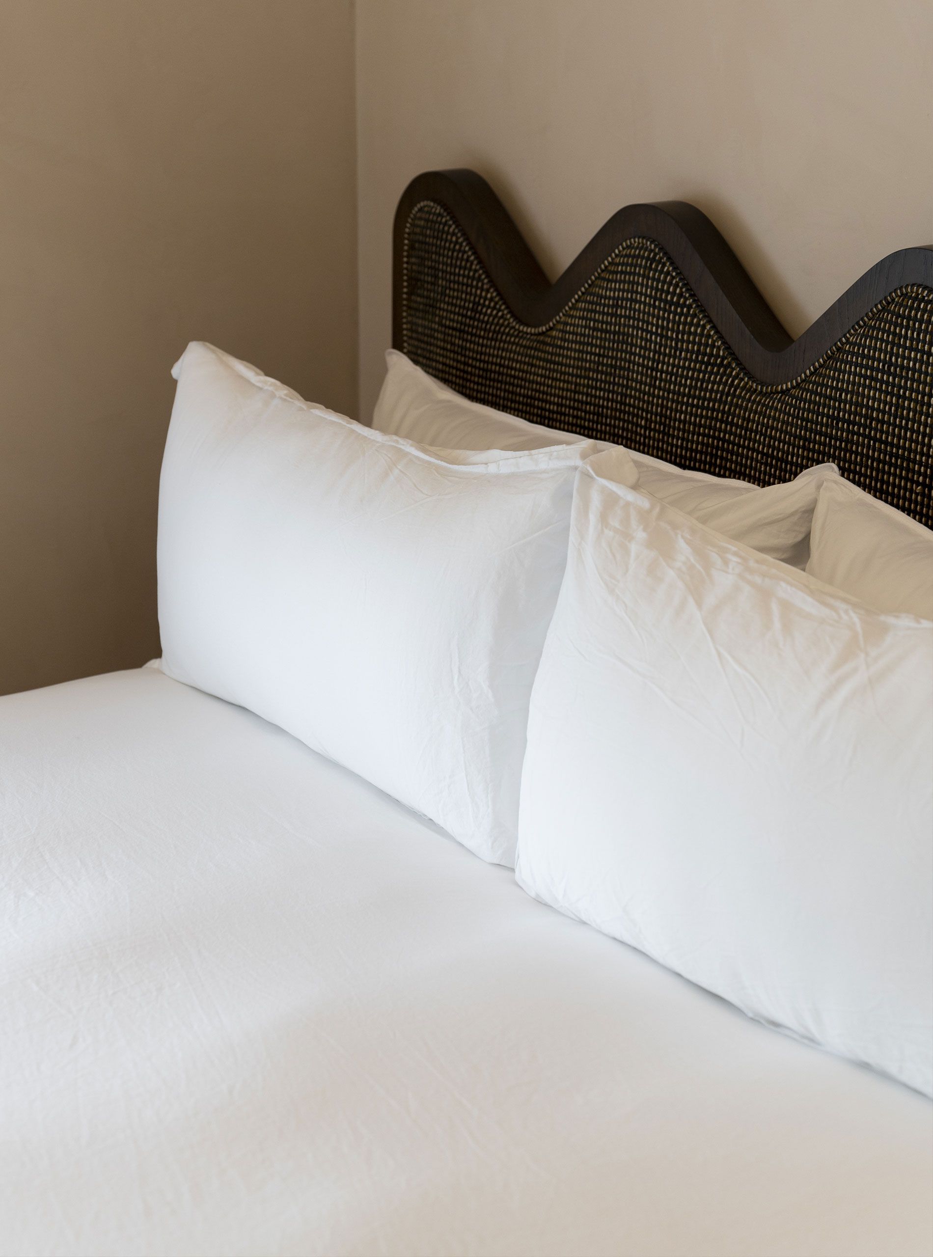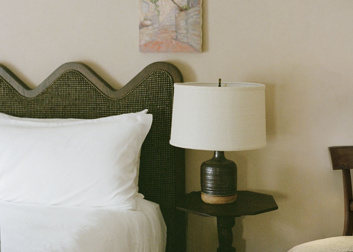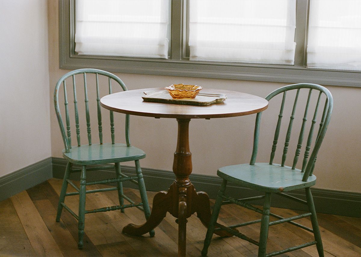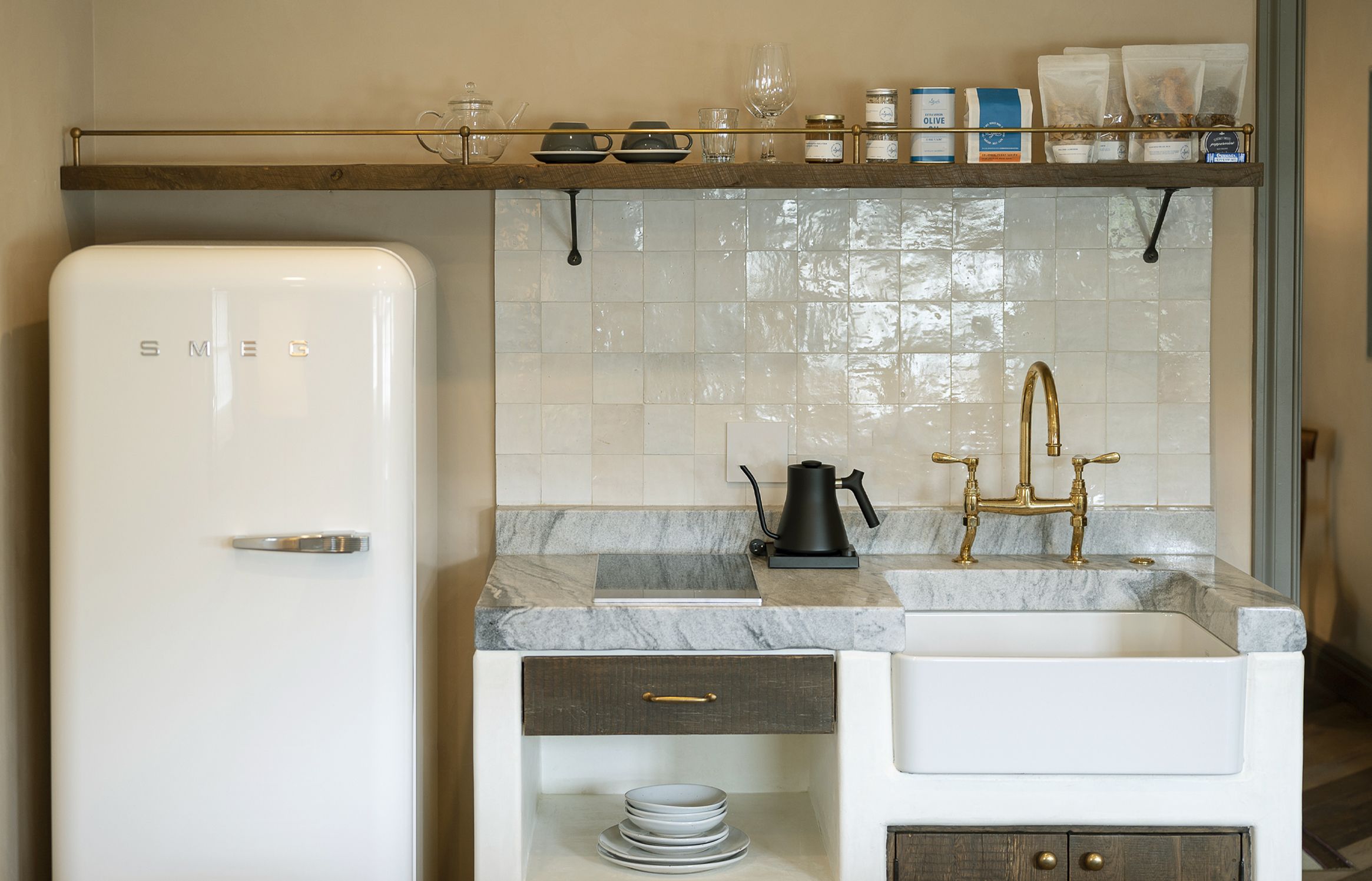 Residential and spacious, Suite 21 includes a private bedroom appointed with a king-sized bed; ample space for living, dining, and relaxing; and a kitchenette with a full-sized Smeg refrigerator. Detailed with vintage finds, custom artwork, and bespoke furnishings — including a dining table — upstairs suites also offer ocean views and access to our private second floor garden terrace.